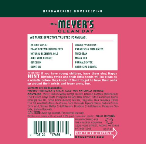 | Ingredients | Water; Cocamidopropyl Hydroxysultaine; Sodium Lauryl Glucose Carboxylate; Lauryl Glucoside; Sodium Methyl 2-Sulfolaurate; Carya Ovata (Shagbark Hickory) Bark Extract; Citrus Aurantium Dulcis (Orange) Peel Oil; Citrus Limon (Lemon) Peel Oil; [Fragrance: dipropylene glycol; triethyl citrate; ethyl methylphenylglycidate; methyldihydrojasmonate; butylphenyl methylpropional; terpenesandterpenoids,lemon-oil; diethyl malonate; isopropyl myristate; ethyl acetoacetate; linalool; limonene; citrus limon (lemon) peel oil]; Citrullus Lanatus (Watermelon) Fruit Extract; Aloe Barbadensis Leaf Juice; Olea Europaea (Olive) Fruit Oil; Glycerin; Decyl Glucoside; Sodium Citrate; Citric Acid; Disodium 2-Sulfolaurate; Potassium Sorbate; Sodium Benzoate |