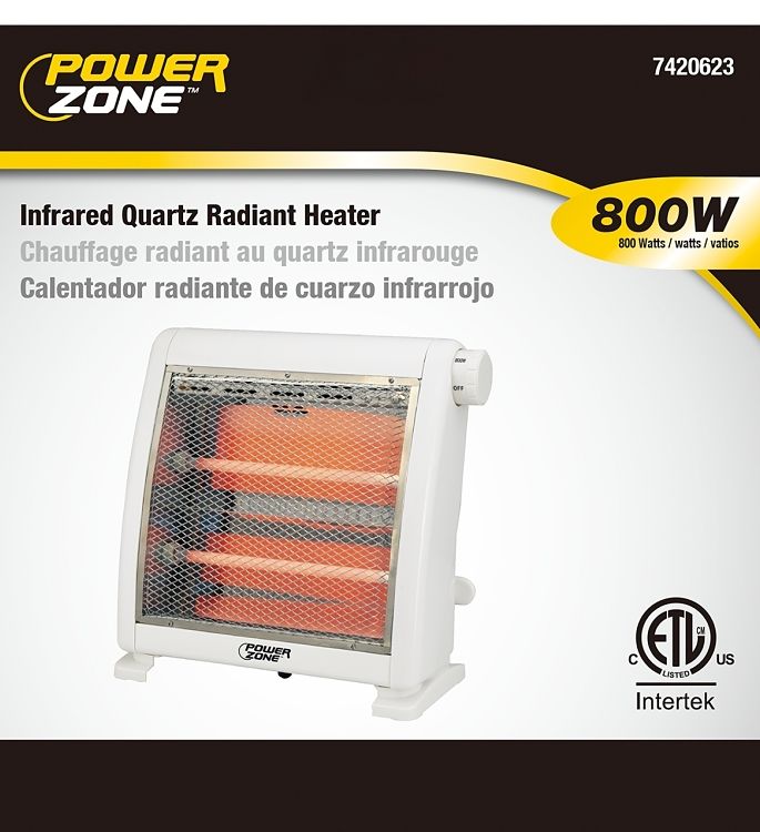 Infrared Quartz Radiant Heater, 400/800W heat settings. Dual infrared quartz element heating technology warms space quickly, evenly & efficiently. Easy-to-use rotary dial control. Automatic overheat protection system & safety tip-over switch.