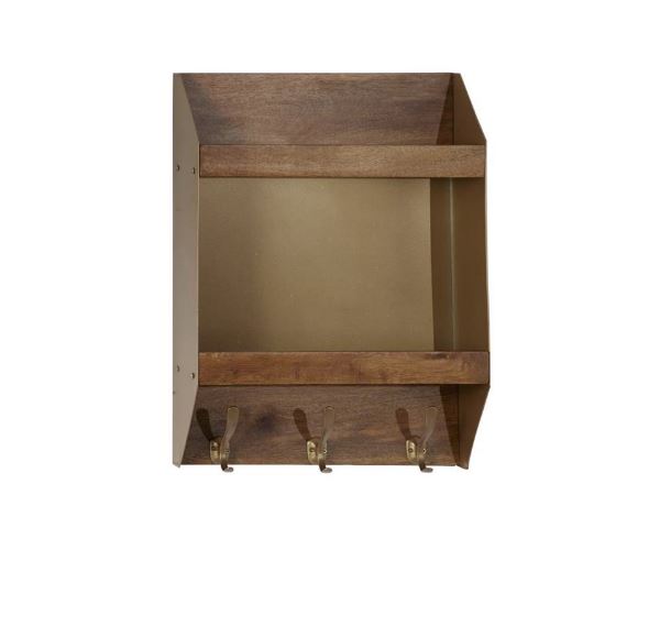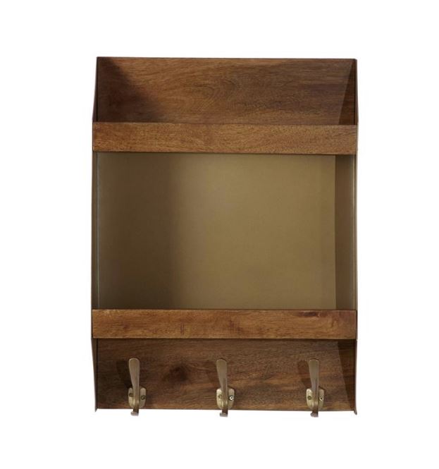 This wall shelf features an industrial inspired design to make your space unique. Wooden shelf with iron hooks-ideal for hanging your belongings like keys and small items. The shelf highlights a natural penny wood brown overall finish.