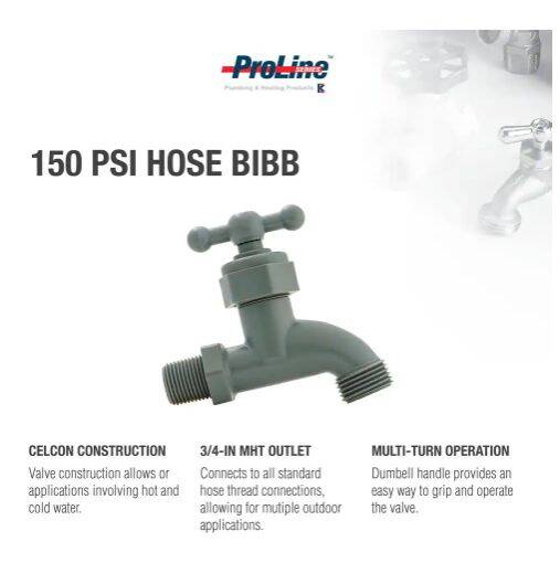 ProLine Series™ 1/2-Inch MIP X 3/4-Inch MHT CELCON® Acetal Hose Bibb controls the flow of hot or cold water through this plastic spigot with male pipe threads, which can be used with various piping, and connects to any standard garden hose.