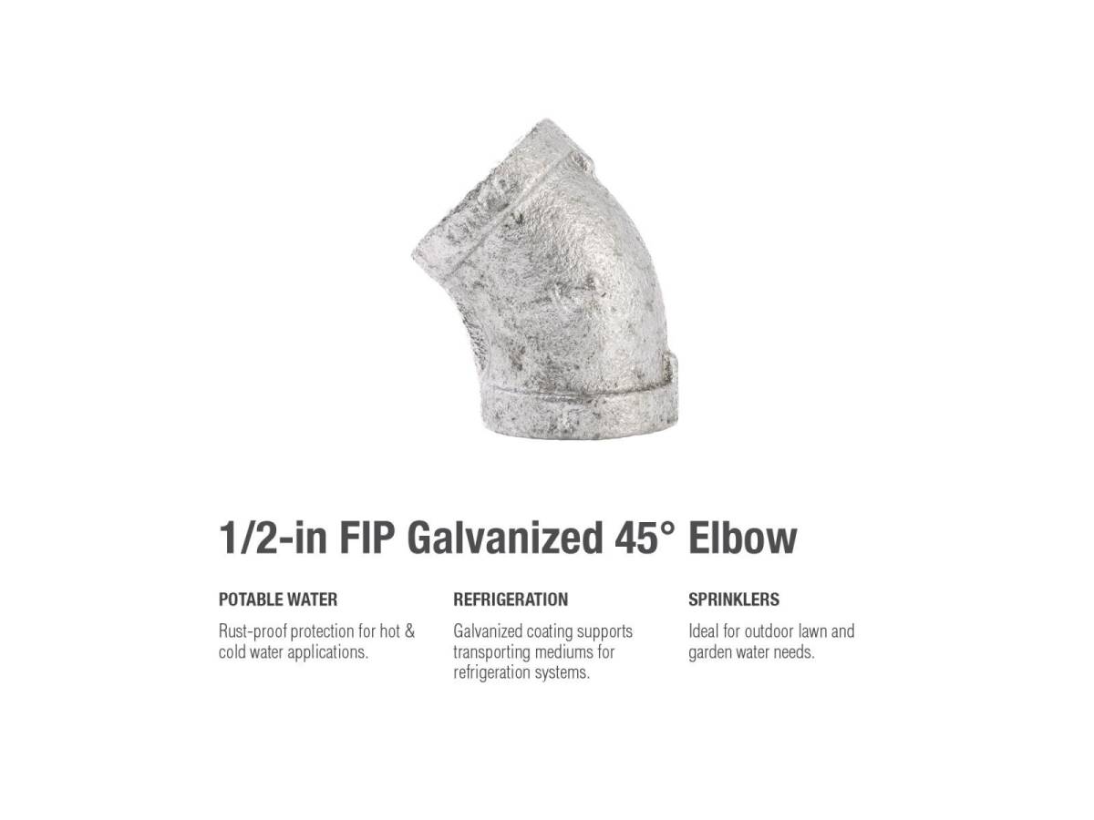 The 45° Elbow allows you to redirect your piping system in a needed direction. This fitting’s galvanization provides a layer of rust-protectant, helping to ensure a long and durable product life. General uses for this product are for transporting potable water, compressed air, drainage or creating your DIY projects.