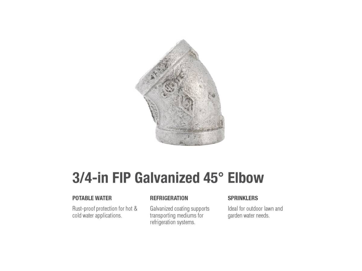 The 45° Elbow allows you to redirect your piping system in a needed direction. This fitting’s galvanization provides a layer of rust-protectant, helping to ensure a long and durable product life. General uses for this product are for transporting potable water, compressed air, drainage or creating your DIY projects.