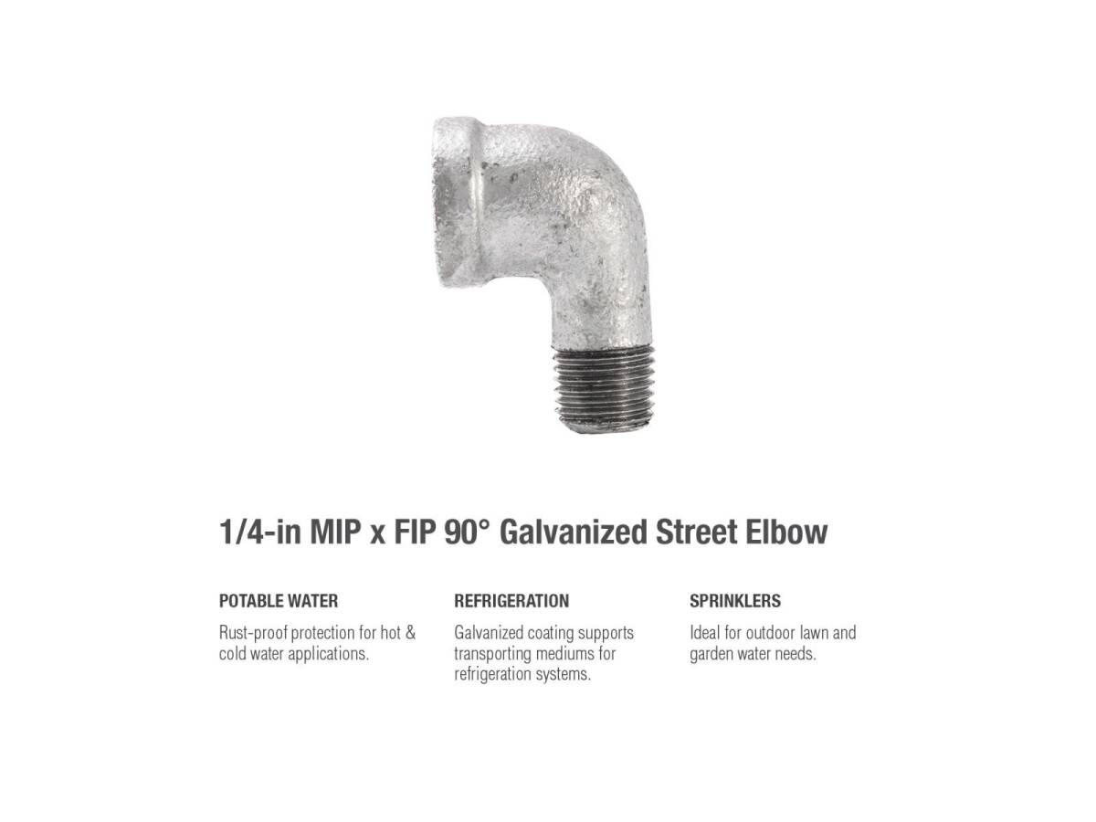 Street Elbows are used around existing piping mounted on flat surfaces such as a wall or ceiling. This fitting’s galvanization provides a layer of rust-protectant, helping to ensure a long and durable product life. General uses for this product are for transporting potable water, compressed air, drainage or creating your DIY projects.