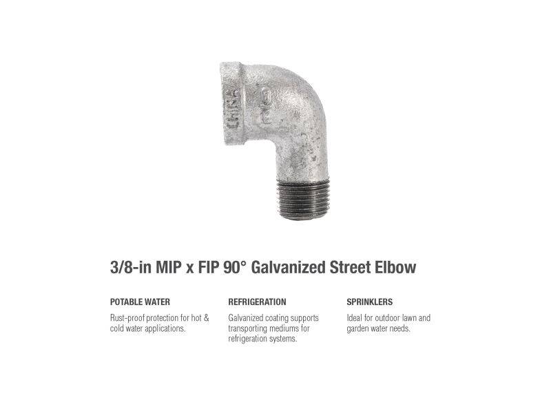 Street Elbows are used around existing piping mounted on flat surfaces such as a wall or ceiling. This fitting’s galvanization provides a layer of rust-protectant, helping to ensure a long and durable product life. General uses for this product are for transporting potable water, compressed air, drainage or creating your DIY projects.