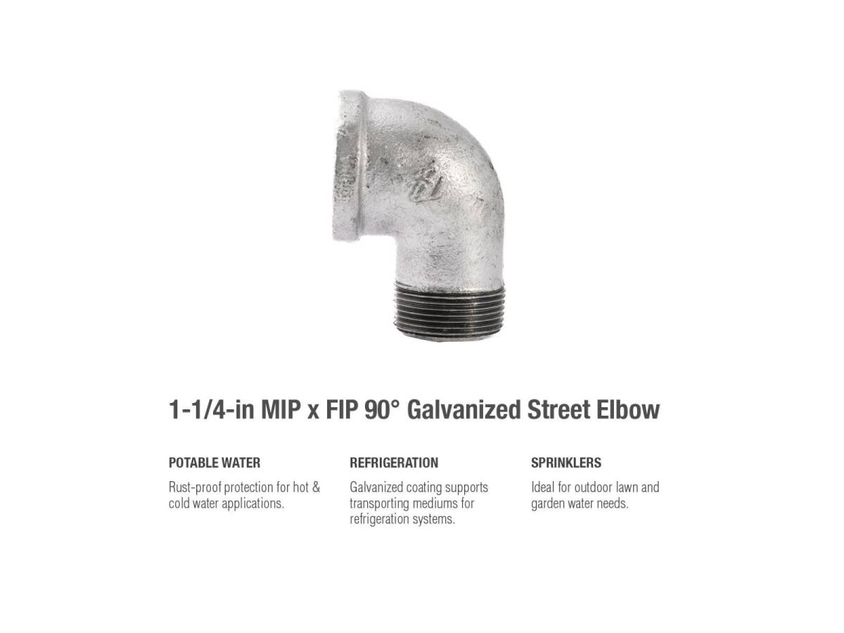 Street Elbows are used around existing piping mounted on flat surfaces such as a wall or ceiling. This fitting’s galvanization provides a layer of rust-protectant, helping to ensure a long and durable product life. General uses for this product are for transporting potable water, compressed air, drainage or creating your DIY projects.