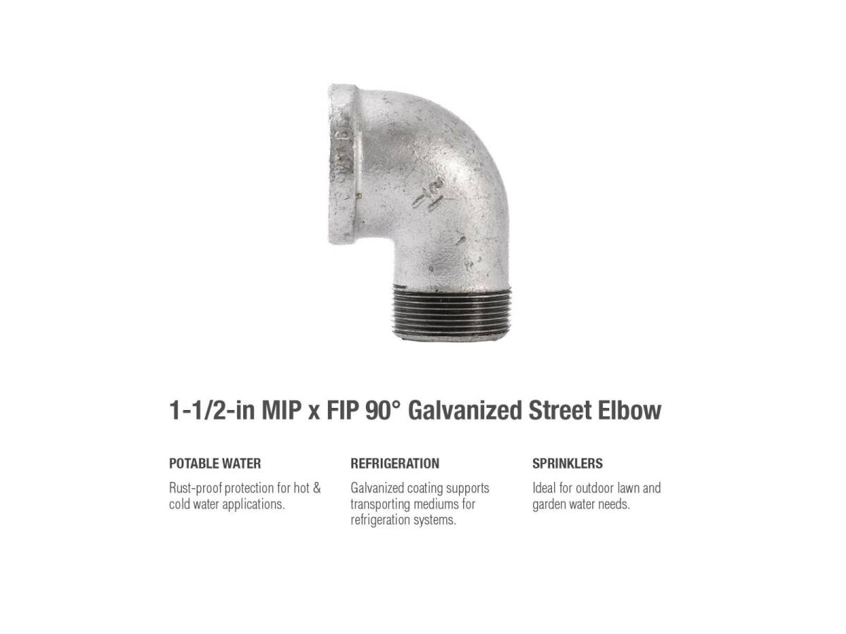 Street Elbows are used around existing piping mounted on flat surfaces such as a wall or ceiling. This fitting’s galvanization provides a layer of rust-protectant, helping to ensure a long and durable product life. General uses for this product are for transporting potable water, compressed air, drainage or creating your DIY projects.