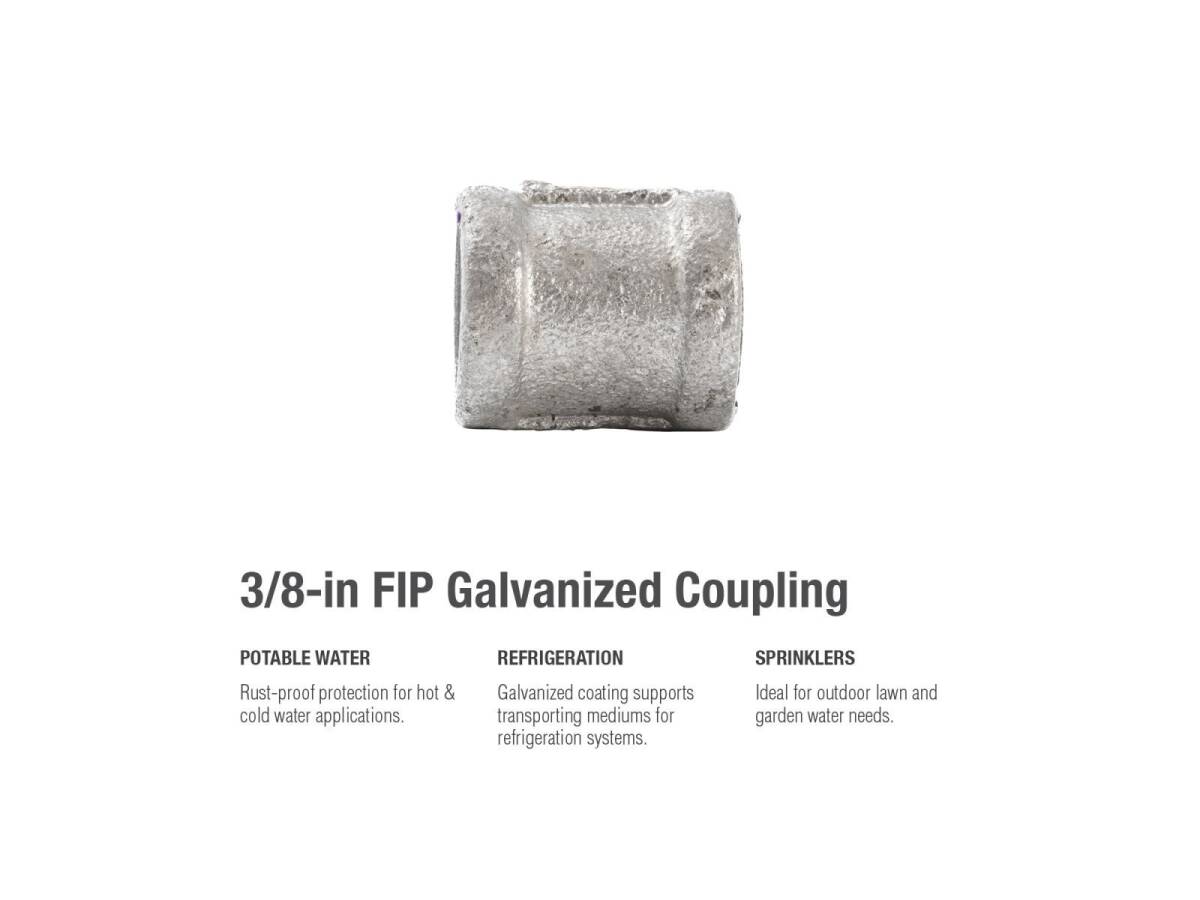 The Coupling is perfect for creating a secure connection between two pipes of matching diameter. This fitting’s galvanization provides a layer of rust-protectant, helping to ensure a long and durable product life. General uses for this product are for transporting potable water, compressed air, drainage or creating your own DIY projects.