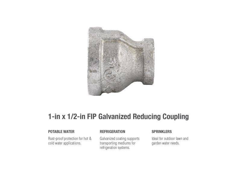 The Reducing Coupling allows you to connect two male-ended pipes of differing diameters. This fitting’s galvanization provides a layer of rust-protectant, helping to ensure a long and durable product life. General uses for this product are for transporting potable water, compressed air, drainage or creating your own DIY projects.