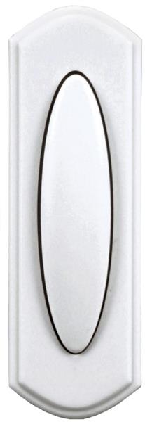 This white, plastic, wireless push button doorbell is battery operated and mounts with screws on the surface of a door frame or exterior wall.