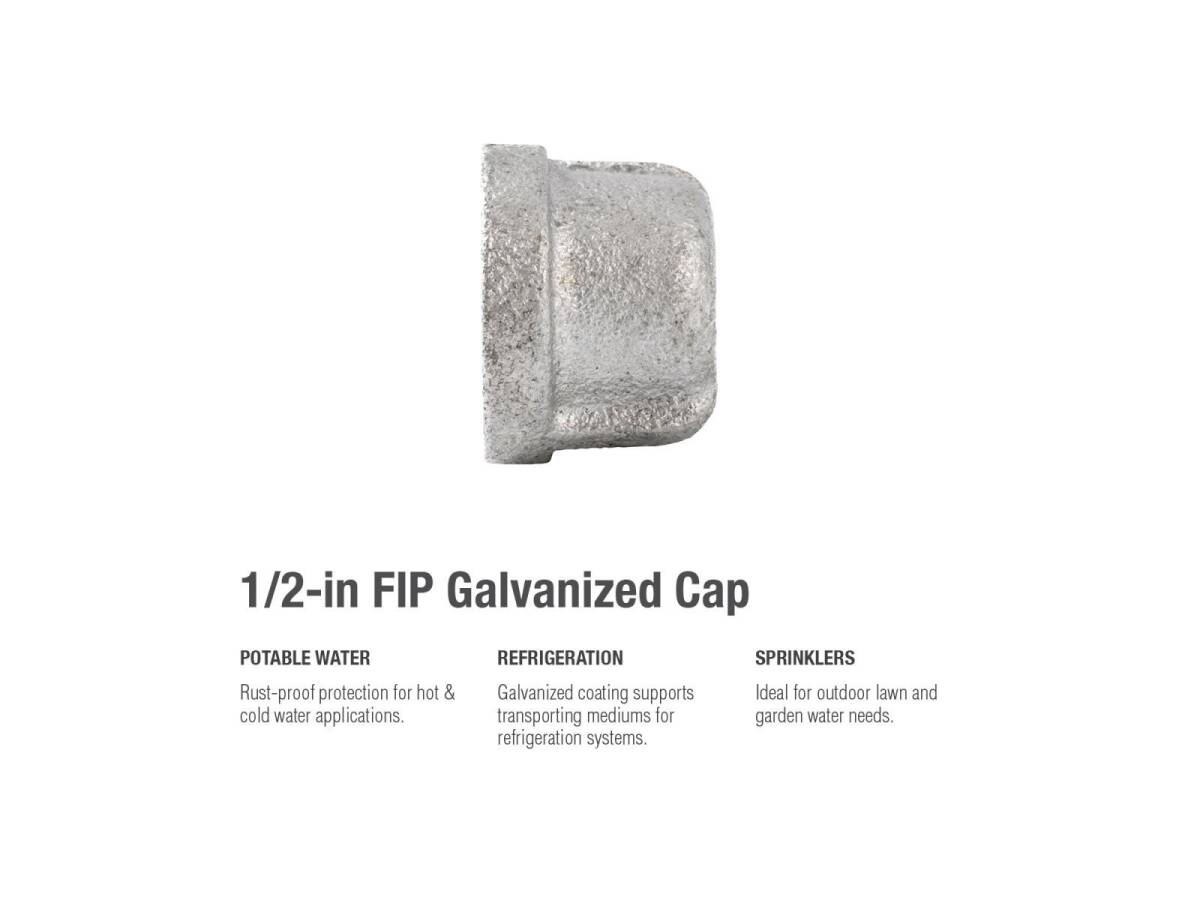 Caps are a great way to secure the end of a piping system. This fitting's galvanization provides a layer of rust-protectant, helping to ensure a long and durable product life. General uses for this product are for transporting potable water, compressed air, drainage or creating your own DIY projects.