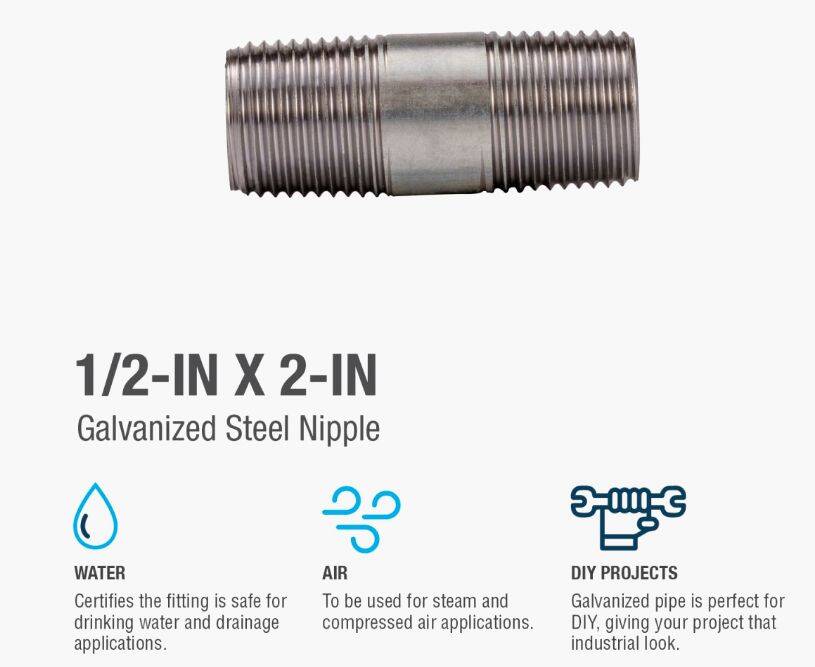 Galvanized nipples and pipe offer a trusted and easy method of transporting plumbing mediums. General uses for this product are for transporting potable water, compressed air, drainage or to create your own DIY projects. This class of pipe is designed for use with other galvanized fittings.