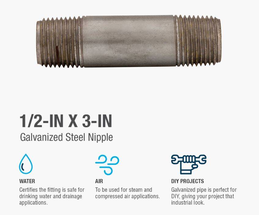 3 in. x 1/2 in. Steel Galvanized Pipe Nipple - Threaded, Schedule 40, 1-Pack