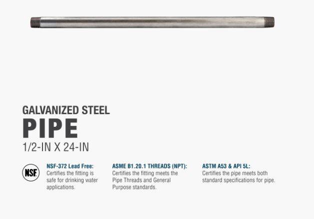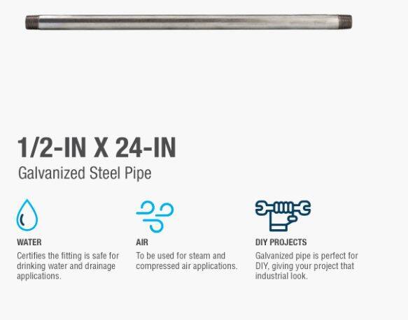 Galvanized nipples and pipe offer a trusted and easy method of transporting plumbing mediums. General uses for this product are for transporting potable water, compressed air, drainage or to create your own DIY projects. This class of pipe is designed for use with other galvanized fittings. Plastic caps are added at each end to better protect the threads during transportation.
