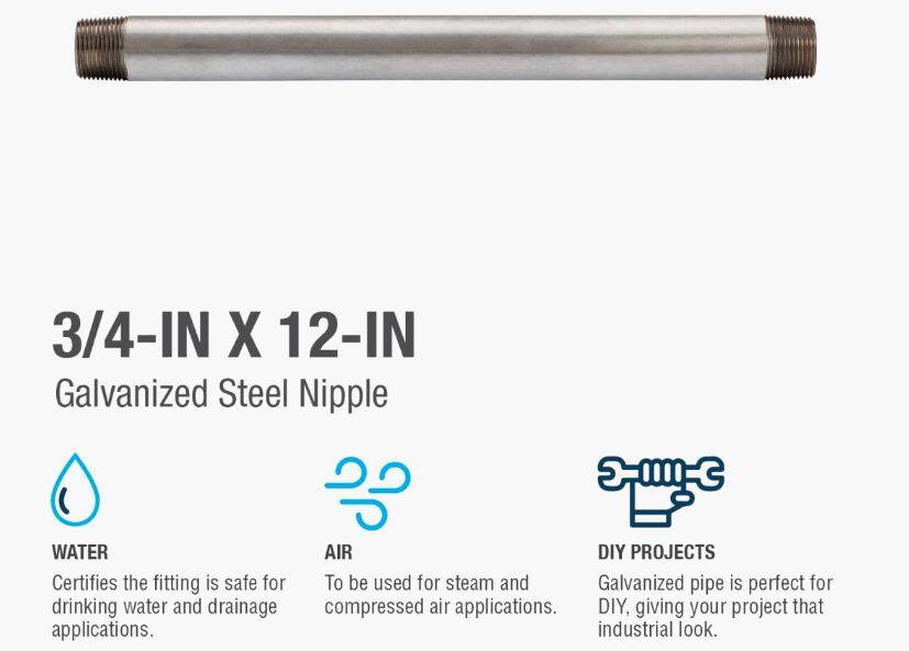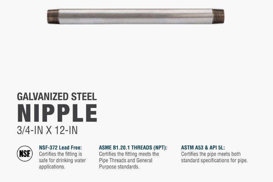 Galvanized nipples and pipe offer a trusted and easy method of transporting plumbing mediums. General uses for this product are for transporting potable water, compressed air, drainage or to create your own DIY projects. This class of pipe is designed for use with other galvanized fittings.