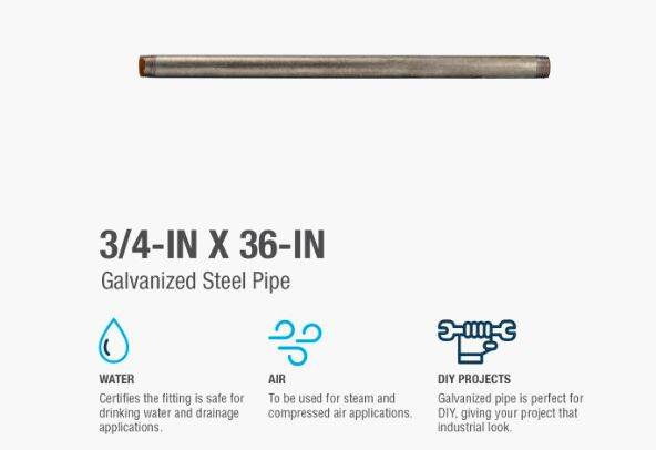 Galvanized nipples and pipe offer a trusted and easy method of transporting plumbing mediums. General uses for this product are for transporting potable water, compressed air, drainage or to create your own DIY projects. This class of pipe is designed for use with other galvanized fittings. Plastic caps are added at each end to better protect the threads during transportation.