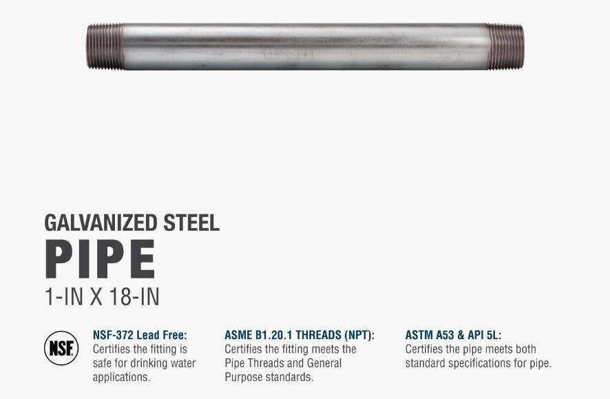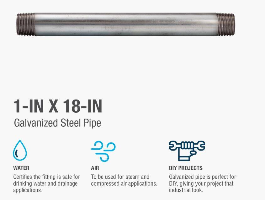 Galvanized nipples and pipe offer a trusted and easy method of transporting plumbing mediums. General uses for this product are for transporting potable water, compressed air, drainage or to create your own DIY projects. This class of pipe is designed for use with other galvanized fittings. Plastic caps are added at each end to better protect the threads during transportation.