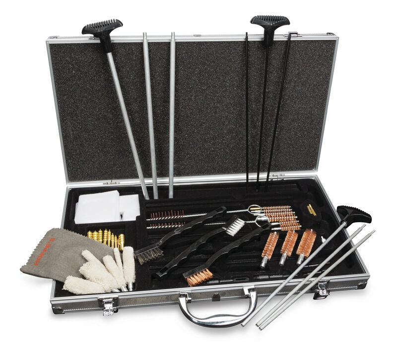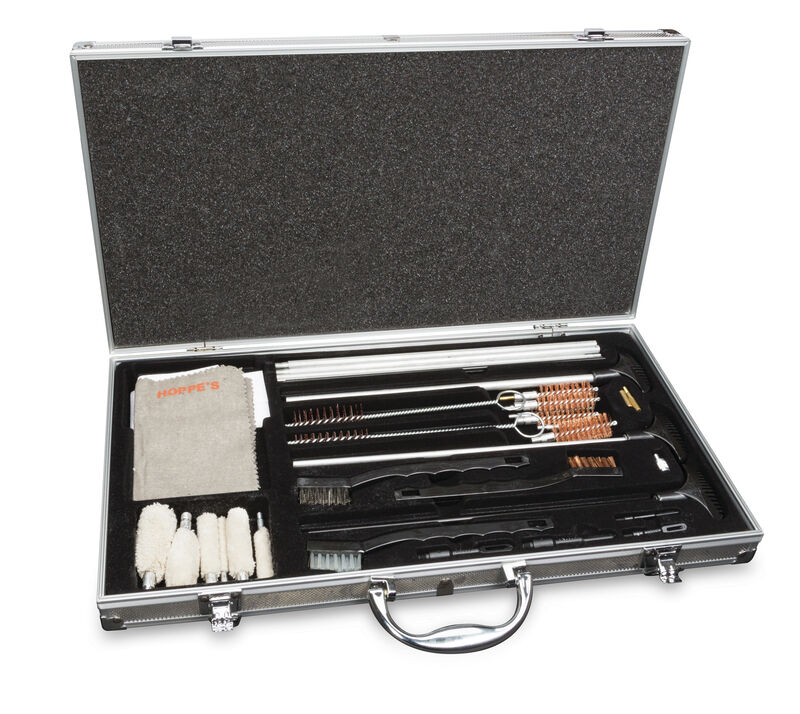 The Premium Gun Cleaning Kit includes all the cleaning accessories necessary to deep clean pistols, rifles, and shotguns that are .22 caliber or larger. This kit includes three different three-piece cleaning rods, ten bronze brushes, six mops, nine brass jags, four slotted tips, three utility brushes, two round receiver brushes, patches, and cleaning rod adapters that are all stored in a convenient hard storage case.