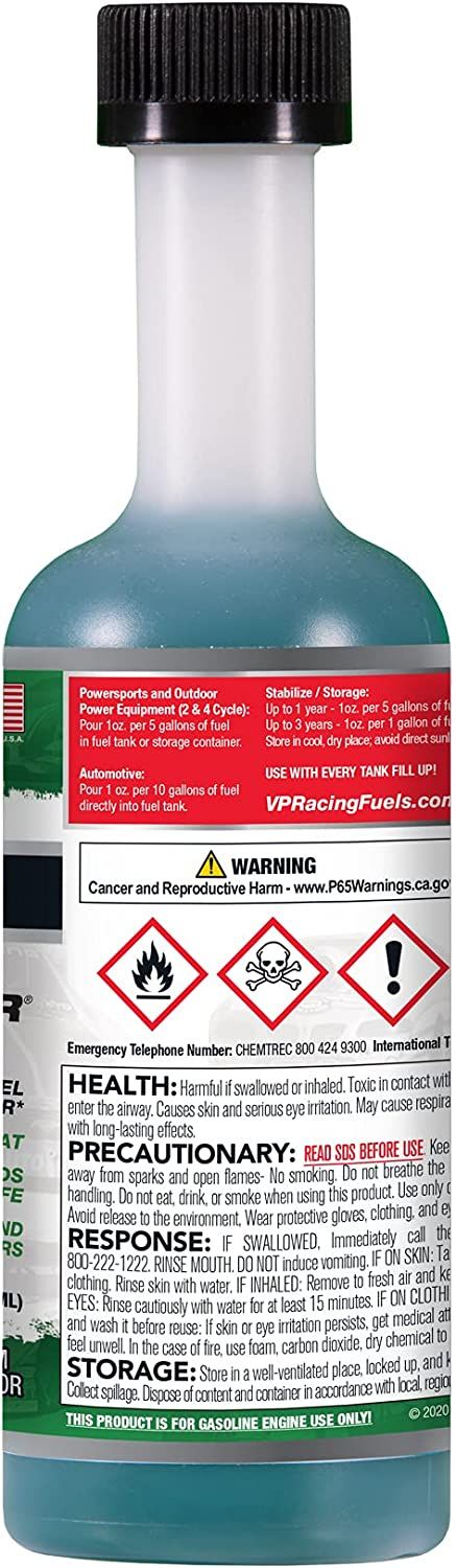 VP Fuel Stabilizer with Ethanol Armor® prevents problems associated with ethanol-blended pump gasoline. It’s like having an ethanol shield for your engine. Our stabilizer keeps vital engine components clean and running at peak performance. It also ensures quick and easy starts. Most importantly, it helps you avoid costly and unnecessary repairs due to long-term storage. We design its proprietary formula not just for cars and trucks; it's also a great fuel stabilizer for motorcycles, lawn mowers, snow blowers, and generators. In fact, it works in any 2-cycle or 4-cycle gasoline engine. It’s a must if you own a vehicle or small engine equipment that isn’t used regularly.