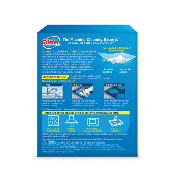 Glisten Cooktop and kitchen cleaning pad is designed to clean and polish gas and electric ranges, cooktops, ovens, range hoods, microwaves, small appliances, sinks, faucets and more in just three easy steps. Glisten is a single solution that does double duty. One non-abrasive side contains a powerful cleaner to effectively cut through grease and baked on food. The other side has a soft cloth to polish, leaving a shiny and streak free surface. Since messes come in different sizes, each cleaning pad is perforated and can be used as one larger pad or separated into two smaller pads.