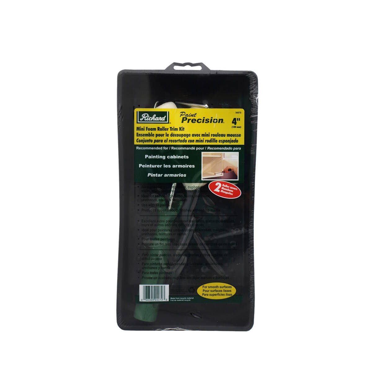 This Mini Foam Roller Trim Kit is recommended for painting cabinets and other smooth surfaces. It includes (2) 4 inch foam