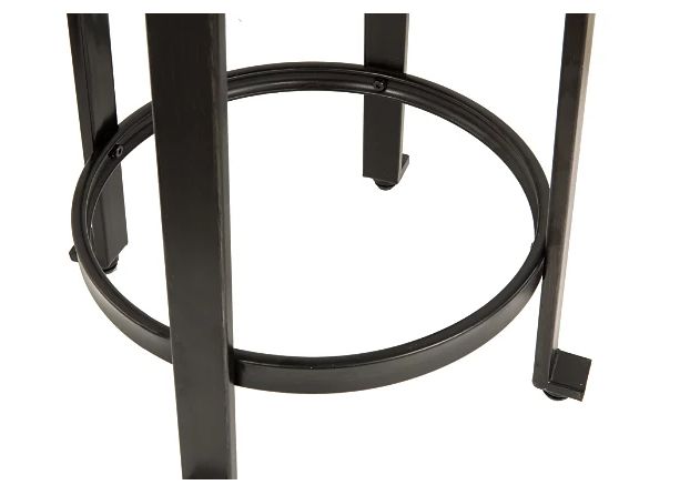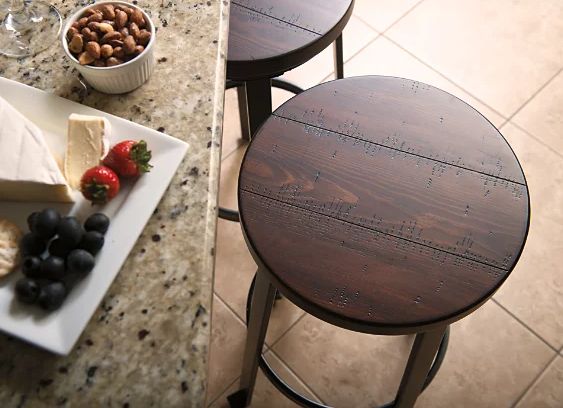 Rustic in feel with modern appeal, the Challiman counter height bar stool is styled with fascinating flair. Veneered plank table surface serves up cool distressed character. Sculptural legs punctuated by L-shape feet form the industrial-inspired base.