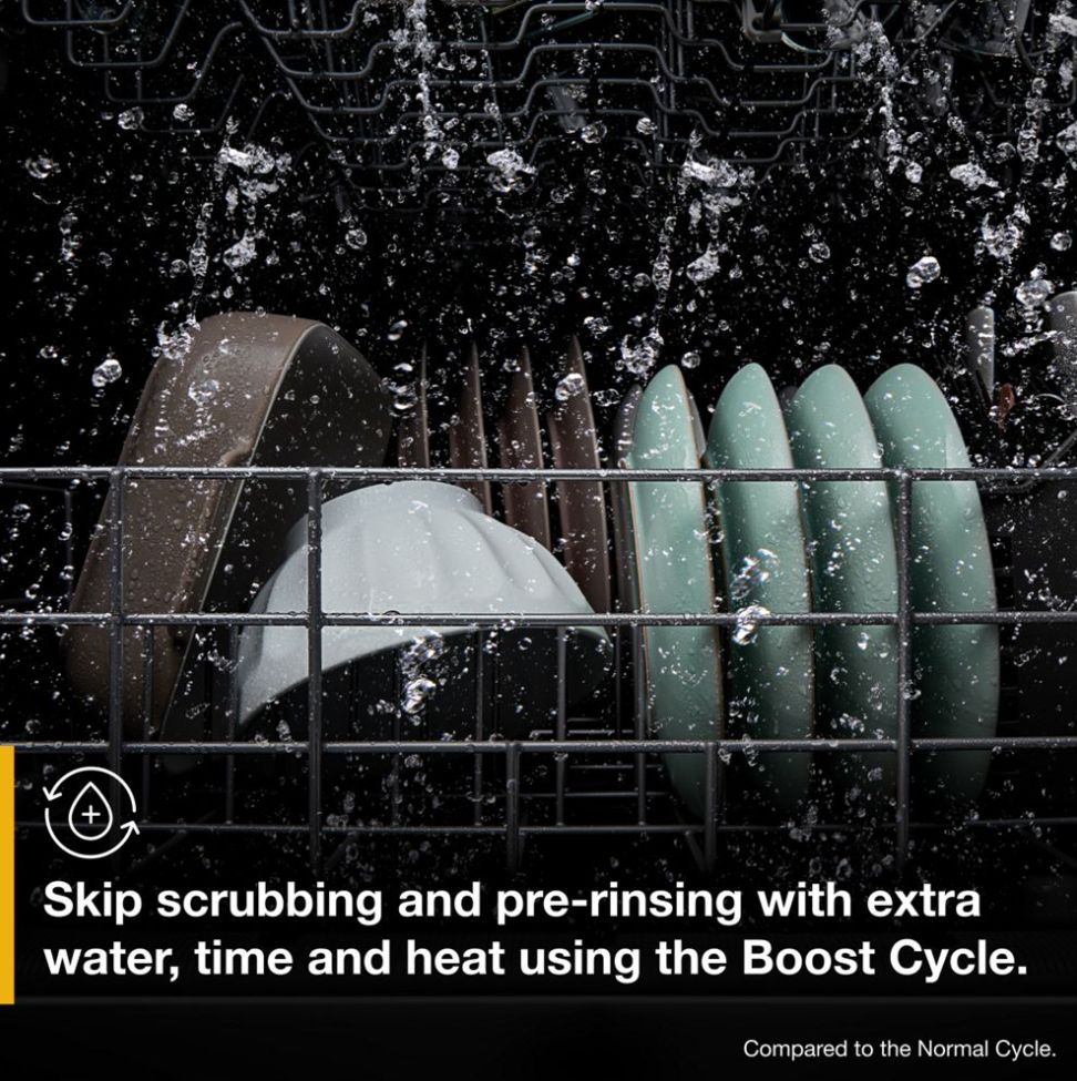 - Boost Cycle- Skip scrubbing and pre-rinsing with the Boost Cycle. This cycle uses more water, time and heat than the Normal Cycle and takes less time than the Heavy Cycle so you can target tough messes that need a little extra effort.