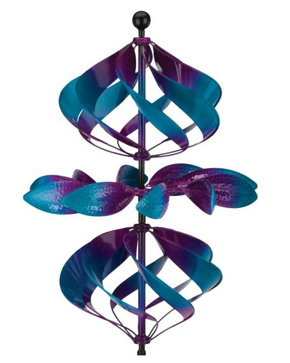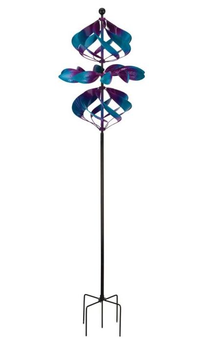 3 levels of spinners. Top and bottom spiral blades spin in opposite directions divided by an array of blue/magenta leaves. A colorful and mesmerizing movement.
