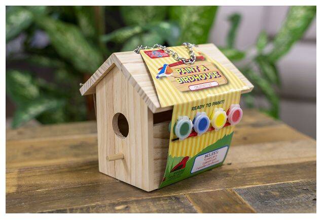 Includes Wooden birdhouse with chain and perch, 4 paints, and paintbrush