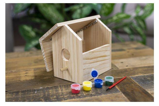 • Includes wooden birdhouse with chain and perch, 4 paints, and paintbrush