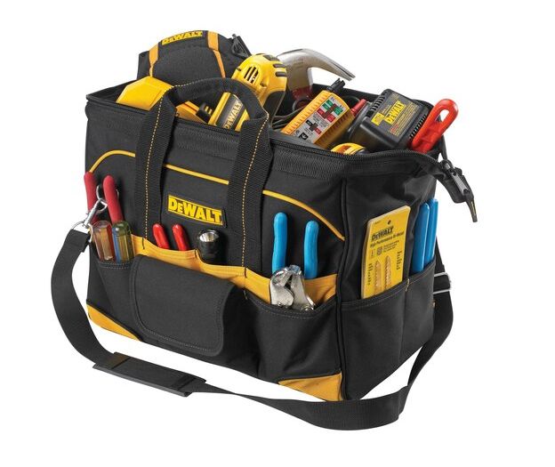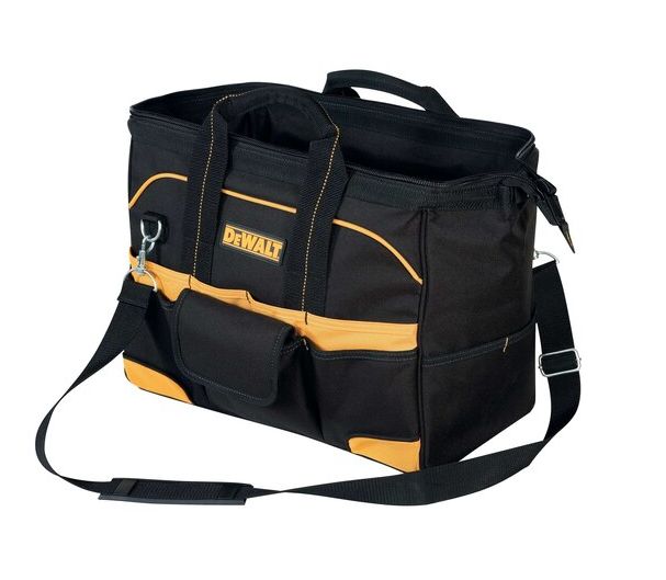 DEWALT's open design easy access tool carrier has 33 tool pockets and sleeves, a zippered main compartment, padded handles, and abrasion resistant rubber feet.