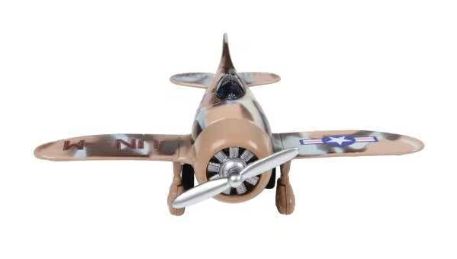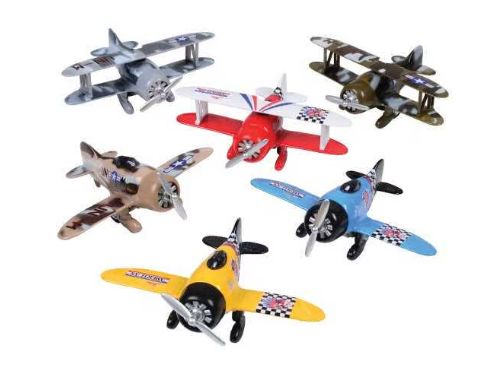 Die cast classic wing fighting plane. Pull-back action propels the plane and spins the propellers. Made of metal and plastic. Item: 5 in L. x 6 in W. x 2 in T.