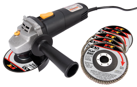 Includes (2) Type 1 metal cut off wheels, 40,80,120 grit flap discs, side handle, replacealbe motor brushes
