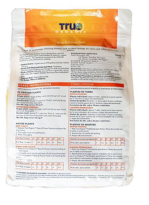 Use True Organic Rose and Flower Food for stunning blooms and verdant foliage on roses and other flowering plants. Exclusive blend of proven farm-grade ingredients for plants and soil, including Seabird Guano, Shrimp, and Crab Shell meal. For in-ground and container plants. Apply monthly during the growing season.