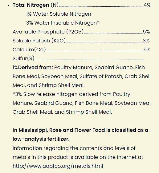 | Precautionary Statement | DO NOT INGEST. Not Suitable for consumption. While True Organic™ Rose and Flower Food is produced with a food safety manufacturing system, we do always recommend wearing gardening gloves and washing your hands after gardening. Store in a dry area away from kids and pets. In Mississippi, Rose and Flower Food is classified as a low-analysis fertilizer. ?Information regarding the contents and levels of metals in this product is available on the internet at http://www.aapfco.org/metals.html |