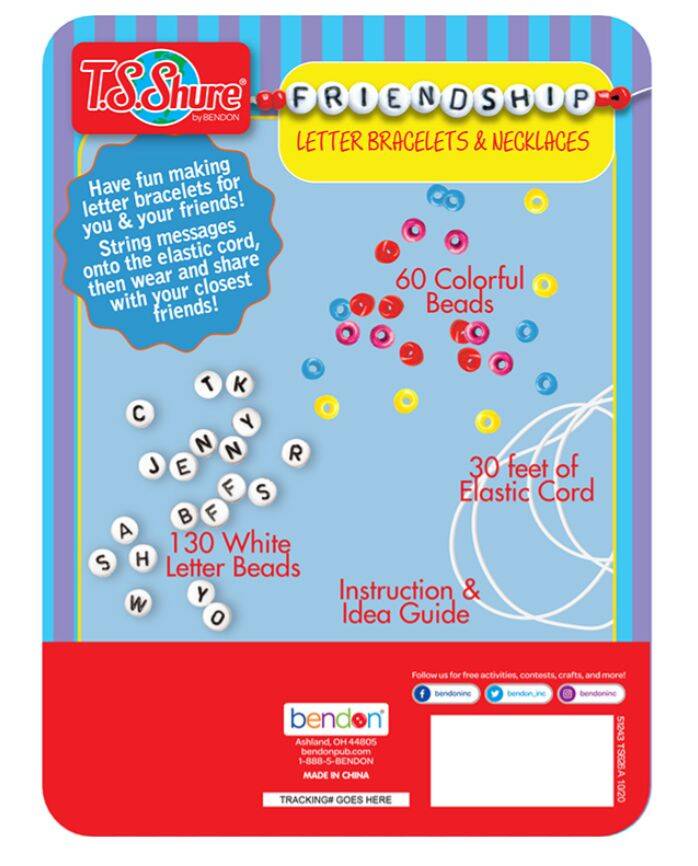 Includes 130 white letter beads, 60 colorful beads, 30 feet of elastic cord, and an illustrated ideas sheet