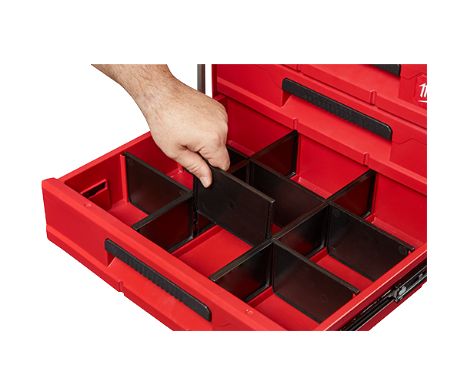 Our PACKOUT 3-Drawer Tool Box has a 50lbs weight capacity and a locking security bar that allows you to padlock the drawers closed keeping them securely shut during transport. As part of the PACKOUT Modular Storage, the toolbox allows you to customize your storage system for easy transportation and organization of tools and accessories. This portable toolbox with drawers is constructed with impact-resistant polymers, all-metal ball bearing slides, and metal reinforced corners for ultimate jobsite durability. The 3-Drawer Tool Box also allows you to customize your drawer layout with Quick-Adjust Dividers (Includes 1 set of dividers). The MILWAUKEE PACKOUT Modular Storage System is the industry's most versatile and durable storage system.