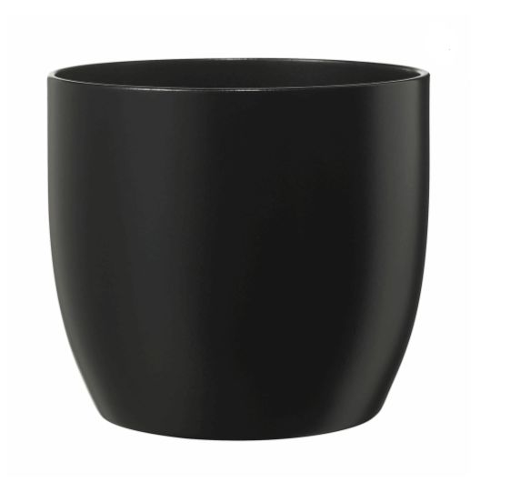 5.1 in Black Basel Fashion Indoor Ceramic Pot. 5 pots per tray must order in tray quantities. 100% waterproof. Made in Germany with 100% rainwater and natural native clay. No drainage holes so no worry about damage to furniture. Just drop in – no need to replant.