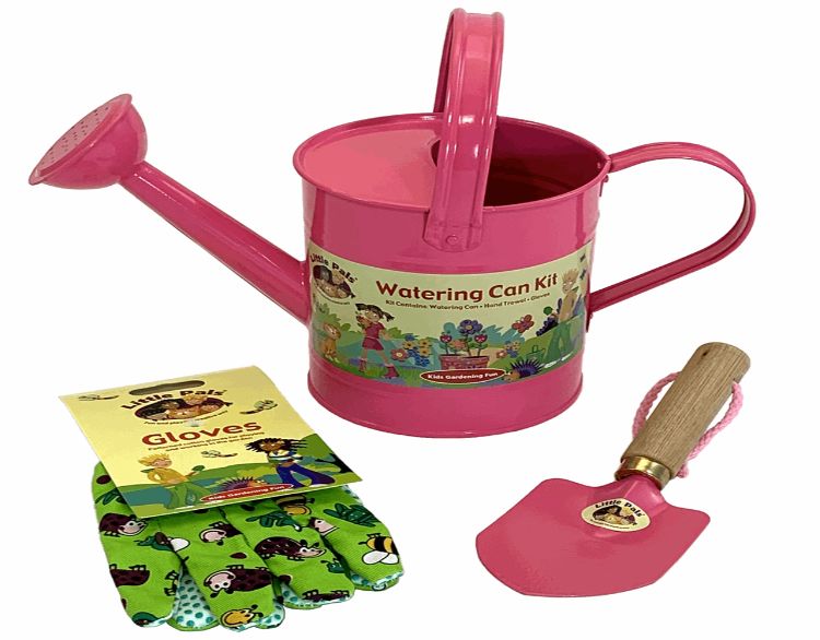 A fun and easy way to get the kids involved with gardening! Set includes metal watering can gloves and hand trowel ÔÇô sized perfectly for little hands. Use the watering can for easy storage of tool and gloves. One size ages 3 to 10