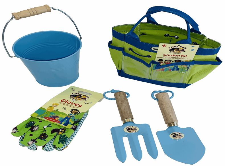 Includes Carry/Storage Bag with Handy Pockets, Hand Trowel and Hand Fork, Kids Gloves, (2) Plant Markers, Matching Bucket