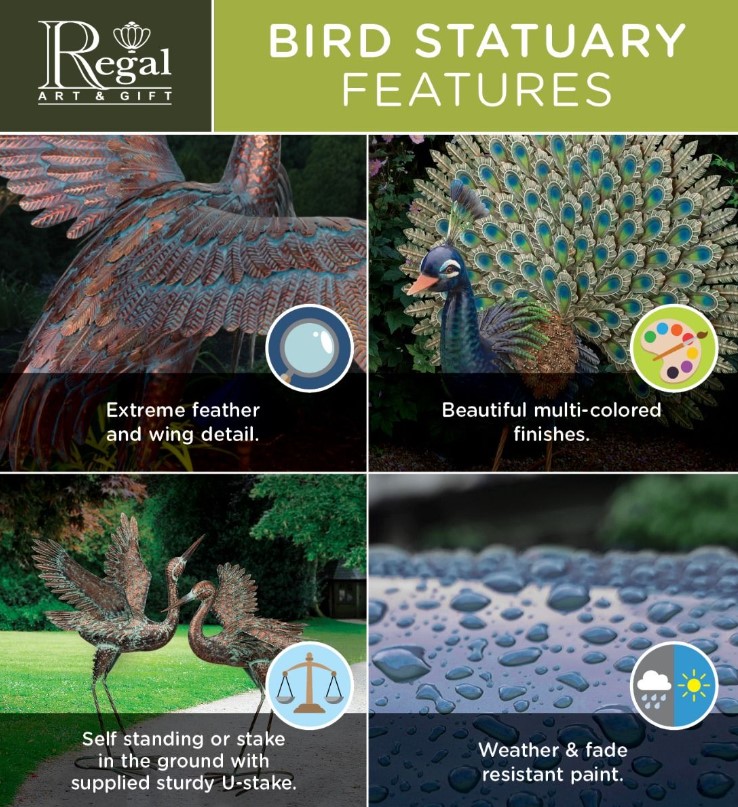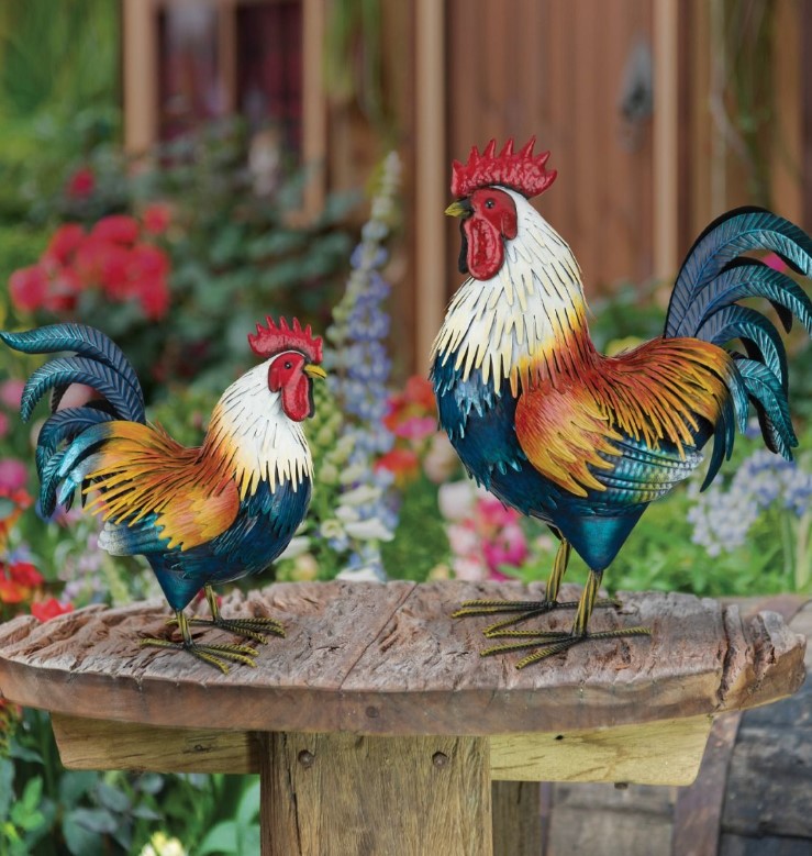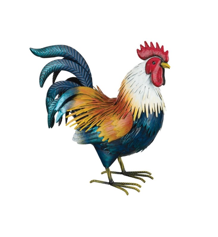 Known for its long tail and vibrant colors, the Golden Duckwing is a beautiful and exotic bird. Made from thick metal with over one hundred vividly painted feathers. Watch as golden yellows, deep blues and vivid greens bring this full size Rooster to life.