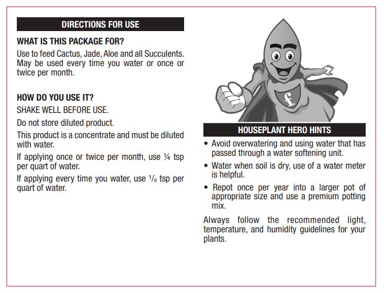 Use to feed Cactus, Jade, Aloe and all Succulents. May be used every time you water or once or twice per month.