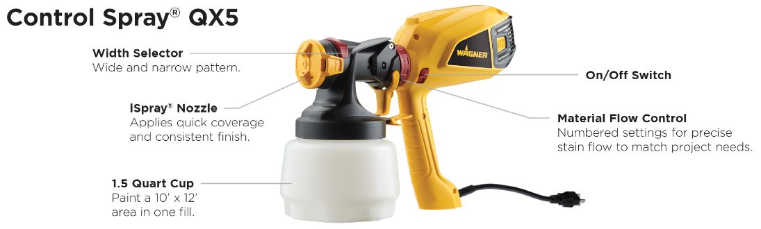 The Control Spray QX5 paint sprayer applies a smooth, consistent finish 5X faster than a brush with no brush marks. It’s ideal for a variety of medium sized projects including spraying sheds, garages, fences, outdoor furniture, and more.