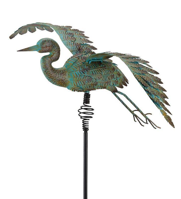 A graceful Crane flies with spread wings and extended feet sits atop a garden stake. The thick coiled spring allows the bird to move in breeze giving it motion. Realistic feather and wing details along with patina finishes make this bird a life-like appearance.