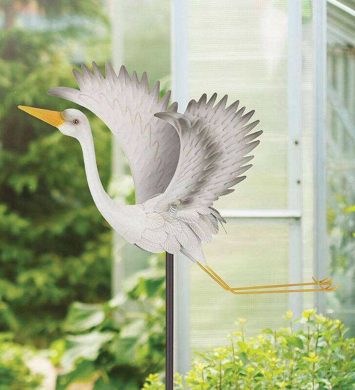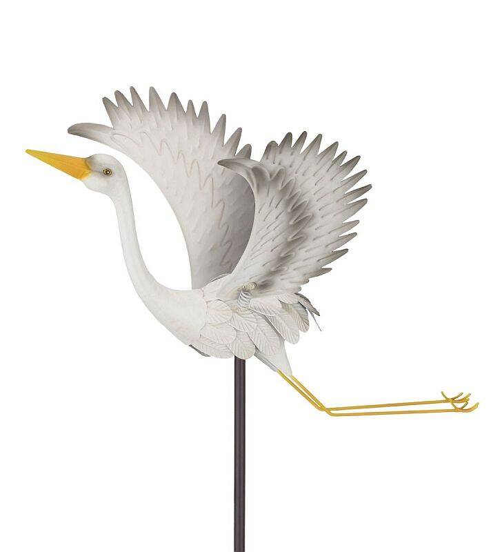 A graceful white Egret flies with spread wings and extended feet and sits atop a garden stake. Springs underneath the wings creates movement in a breeze giving a lifelike effect.