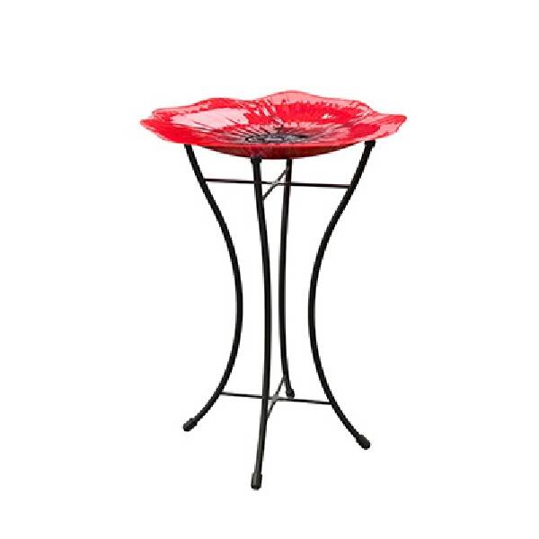 16-Inch Red Poppy Glass Birdbath With Stand