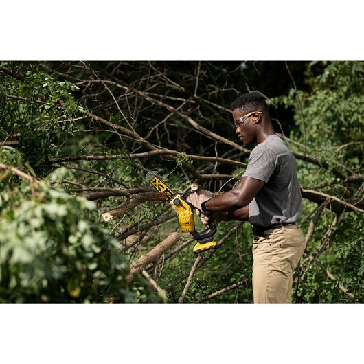 Lightweight and compact, the 20V MAX 8 in. Cordless Pruning Chainsaw has a high-efficiency brushless motor designed to maximize runtime and motor life with up to 70 cuts per charge. (Using DCB230 battery -sold separately), tested on 4 in x4 in Pressure-Treated Pine. Weighing just 4.6 lbs -tool only), the Pruning Chainsaw is 61% lighter (When compared to the DCCS620 chainsaw -tool only) and 3x more compact, designed to reduce fatigue while cutting, trimming and pruning. Use it to trim branches from downed trees, cut bundles of wood or branches, and manage thick brush or daily pruning needs. Compact design allows for easy access to tight spaces. Integrated tip guard is designed to provide stability during upcuts, and onboard wrench allows for tool-free tensioning.