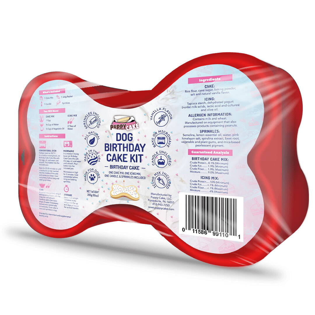 Your Dog's tail is sure to wag for this Birthday Cake flavored Cake mix. Our cake mixes result in a light, fluffy and moist cake for your dog to enjoy. We believe that our furry friends should be celebrated in style, which is why we wanted to create healthy birthday cakes you can make at home. These dog birthday cakes come complete with icing so you can have a dog bakery at home! Fed in moderation, Puppy Cake is a fun and healthy supplement to your dog's diet.
