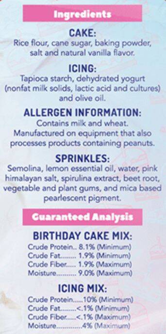 | Ingredients | Cake Mix- Rice flour, cane sugar, baking powder, salt, and natural vanilla flavor Icing- Tapioca starch and dehydrated yogurt (nonfat milk solids, lactic acid and cultures) Sprinkles- Semolina, lemon essential oil, water, pink Himalayan salt, spirulina extract, beet root, vegetable and plant gums, and mica based pearlescent pigment. |