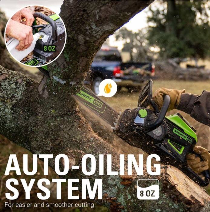 Get the equivalent power of a 45cc gas engine without the hassle of gas and fumes. The Greenworks Pro 80V 18" Brushless Cordless Chainsaw starts easily and one 4.0 Ah battery charge can make up to 150 cuts through 4" x 4" pressure treated lumber. The Greenworks Pro 80V lineup features over 75 high-performance Pro 80V tools, allowing you to ditch your gas tools for an innovative, eco-friendly alternative.
