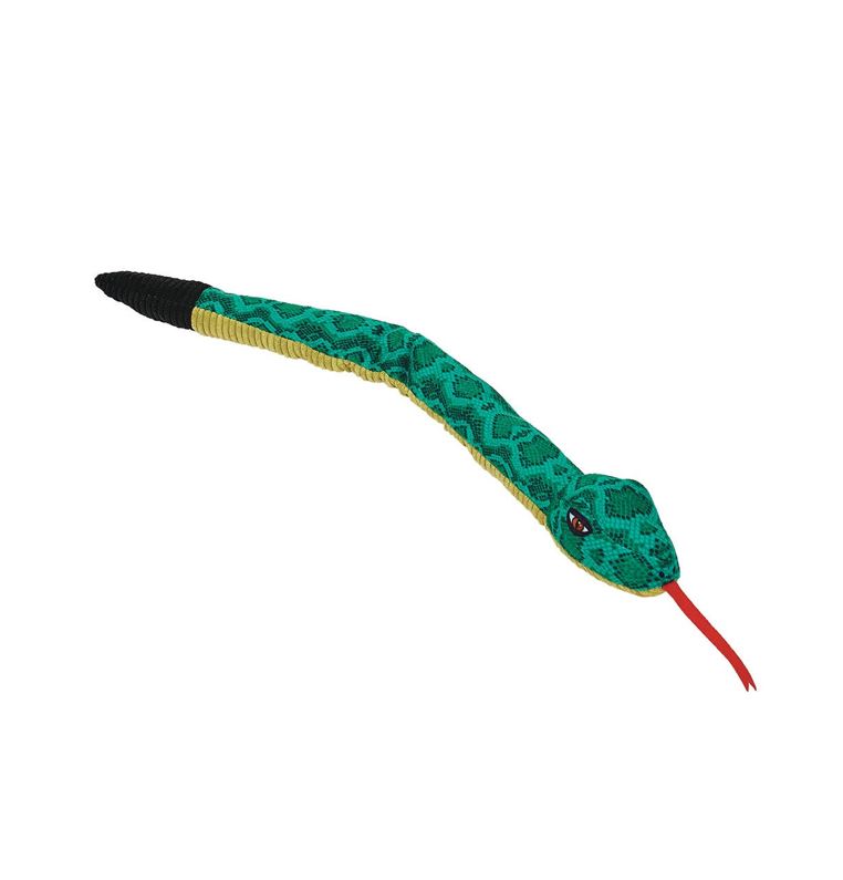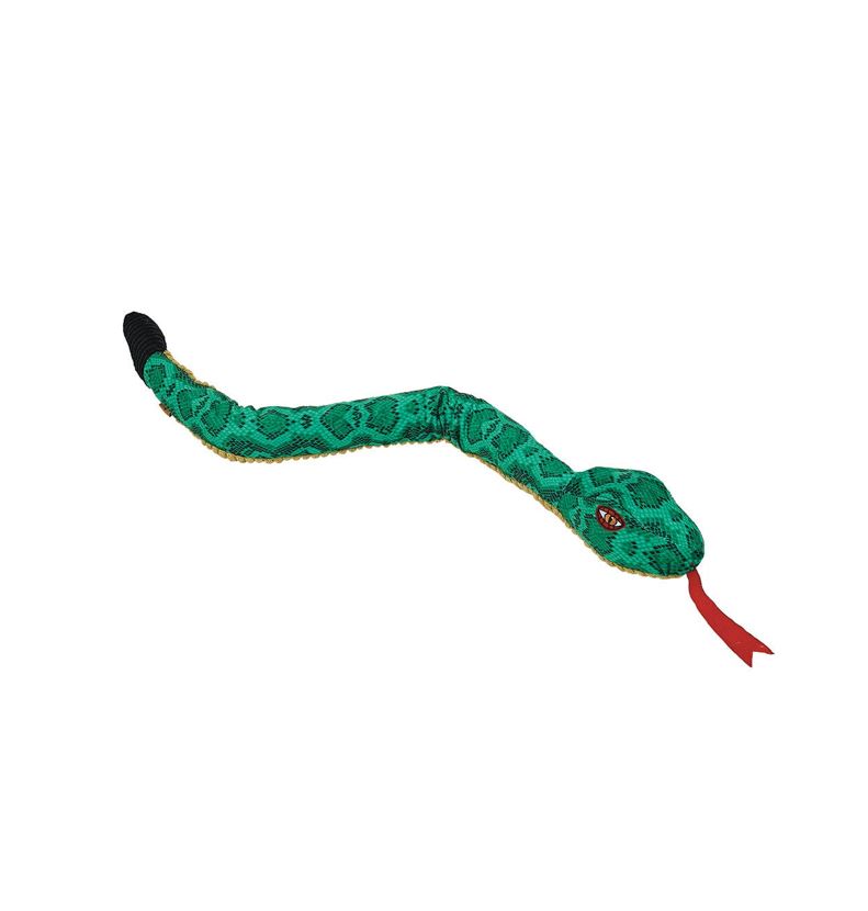 A multi-sensory toy sure to excite dogs of all sizes! Made of soft poly material and fill, with a ribbed texture on bottom and reptilian body pattern. Squeaker in the head creates excitement, crinkle fabric in body and rattler in tail all add to the excitement and entice dogs to play for hours!